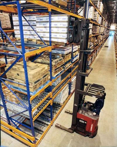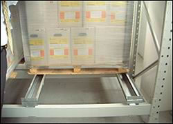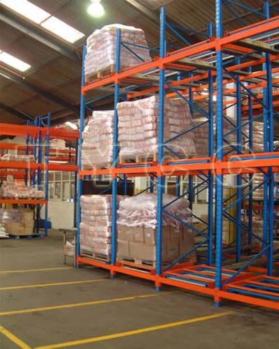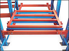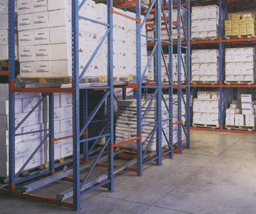 1.推入式货架系统(也称谓之压入式货架),是高密度存储的货架系统之一,适合少品种、大批量货物的存储。 2.该系统依据\"先进后出\"的原则把货物放置在倾斜的滚道上,运载台车沿轨道运行,托盘放置在运载台车上依次被后推至货架内部,有效深度在5个托盘位。 3.取货时第一个托盘提取后,下一个托盘自行滑至取货点,有效地利用单一通道进行存取,尤其适用于货物中转区的存储管理。 4.安全性与运转效率都高于驶入式货架。与普通货架相比,可以提高地面60%左右的使用率。仅需配套前移式叉车或平衡重式叉车即可使用,且对叉车操作要求比驶入式低. |