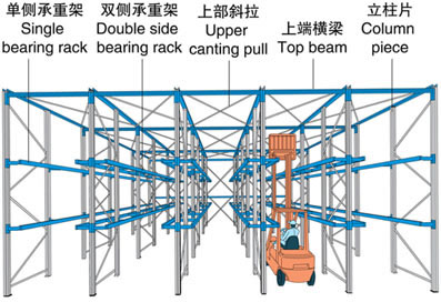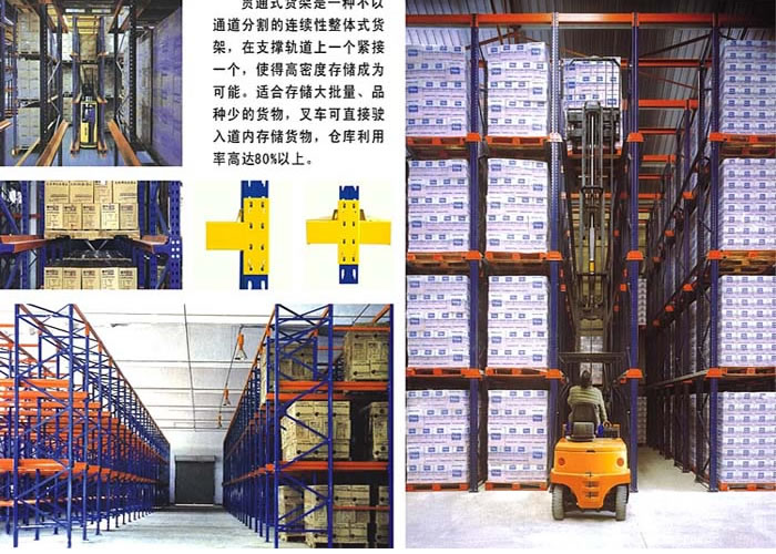 1.贯通式货架又称通廊式货架或驶入式货架,全插接组装式结构,柱片为装配式结构,牛腿为一次性冲压十字型牛腿,强度高刚性好,外形美观,顶梁与柱片间为螺栓连接式结构; 2.靠墙区域的货架总深度一般较好控制在6个托盘深度以内,中间区域可两边进出的货架总深度一般较好控制在12个托盘深度以内,以提高叉车存取的效率和可靠性。 3.此种货架系统的稳定性是所有种类货架中较为薄弱的,为此货架不宜过高,一般在11m以内,另外系统中还需加设拉固装置。 4.此种系统货架排布密集,空间利用率极高,几乎是常规托盘式货架的两倍,适于储存少品种大排量同类型货物,货物可从同一侧存入取出(先进后出),也可从一侧存入另一侧取出(先进先出),多用于乳业、饮料等食品行业,冷库中也较为多见。 |